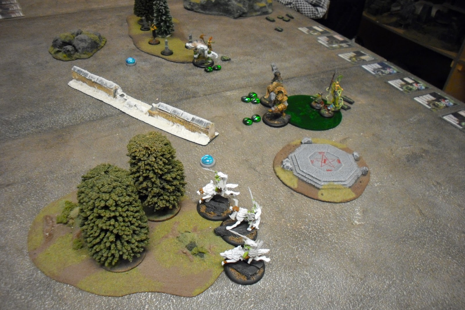 The Woldwarden took out the remaing Zealots, earning my first scenario point. The Swamp Gobbers had to move up into the control zone to contest the zone and prevent the Reckoner to get LOS to anything valuable. The Feral ran up towards my left flank to be able to get a charge lane to the Reckoner. Krueger cast Deflection again and saved some Fury.
